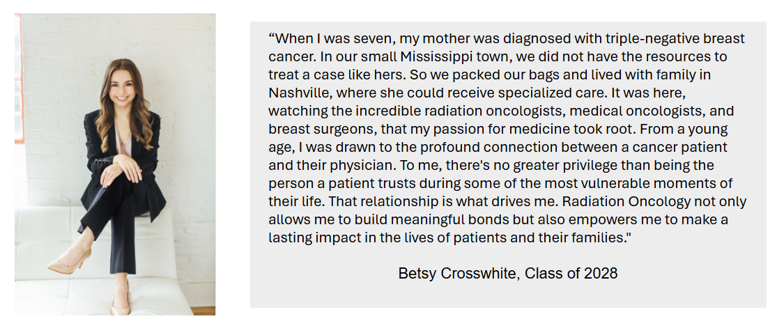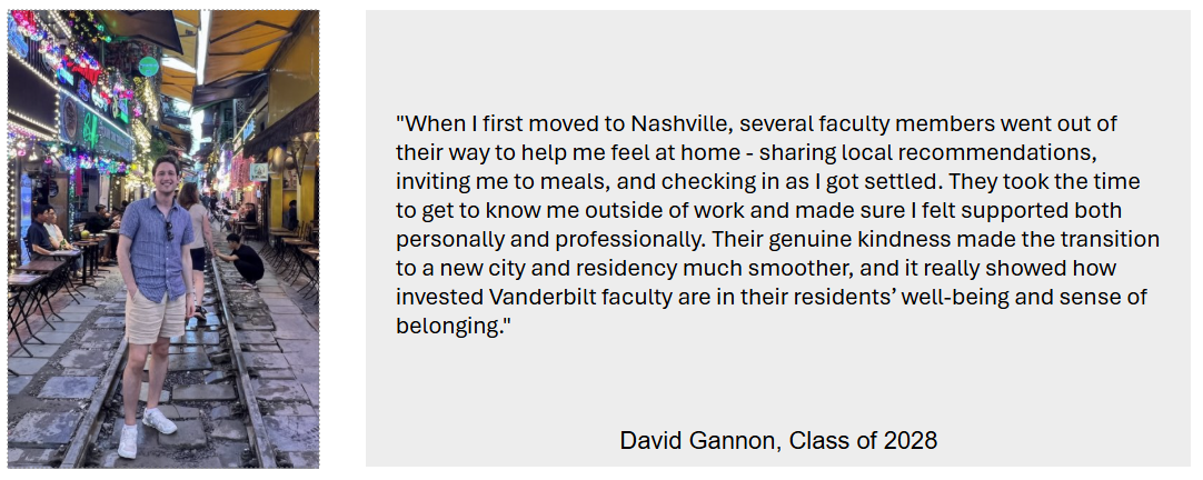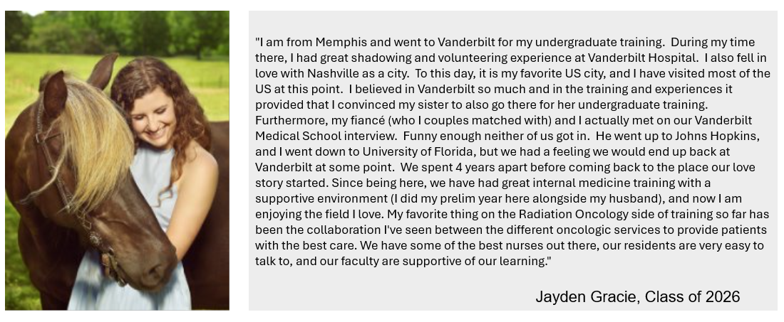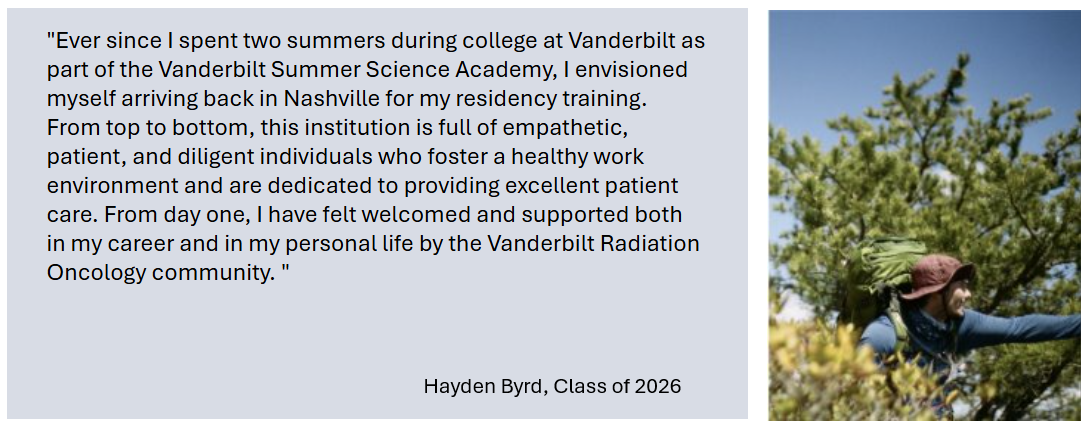 Click on the questions below to hear from our current residents!Return to the main Residency Program page Why did you decide to pursue Radiation Oncology? Why did you choose Vanderbilt for training? Why did you want to live in Nashville? Tell me about a time Vanderbilt faculty/staff went above and beyond to show that they care about you as a person?